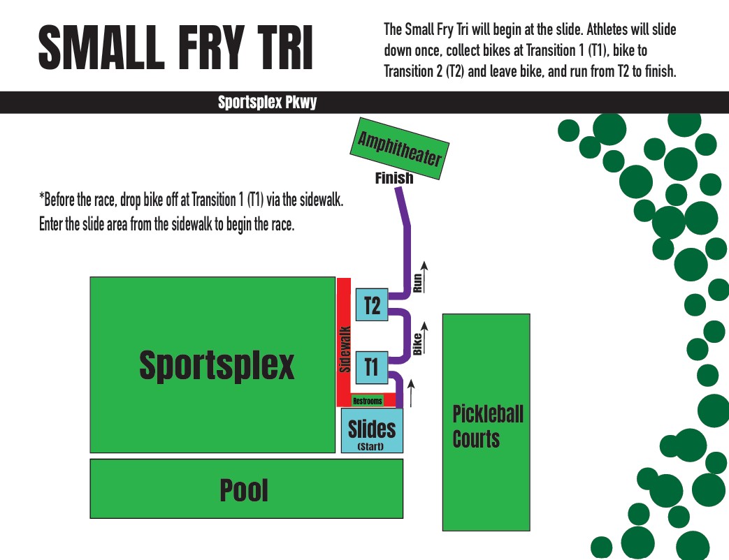 Note: Five-year-olds can opt to participate in the Sportsplex Tri for Kids instead of the Small Fry Tri, but they must be able to complete the race independently. For more details about the Sportsplex Tri for Kids, visit the Race Details page.